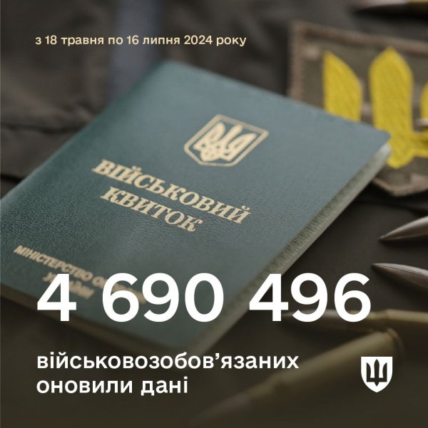 “На вимогу закону про мобілізацію протягом 2 місяців, з 18 травня по 16 липня 2024 року, військовозобовʼязані повинні були оновити свої дані. За результатами оновлення, 4 690 496 військовозобов’язаних виконали свій обовʼязок”, — йдеться у повідомленні.