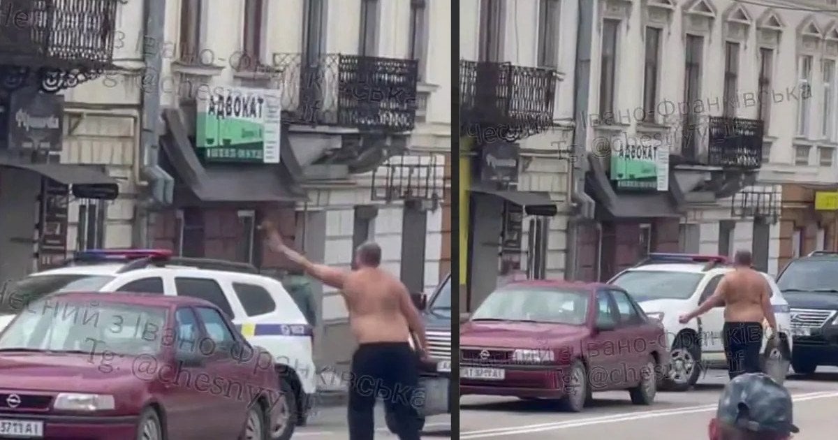 На опублікованому у місцевому Telegram-каналі «Чесний з Івано-Франківська» відео видно, що чоловік з оголеним торсом та з відром у руці ходить вулицею серед автомобілів.