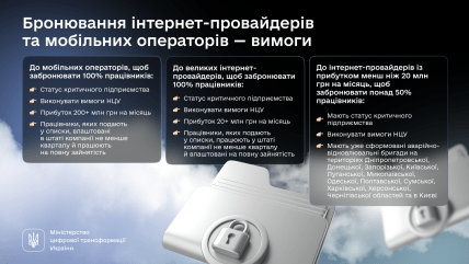 Так, компанії мобільних операторів повинні мати дохід понад 200 млн гривень, а інтернет-провайдерів – понад 20 млн гривень. Підприємства мають набути статусу критичності за зазначеними критеріями. А працівники, яких хочуть забронювати, мають працювати у штаті не менше трьох місяців на повну зайнятість.