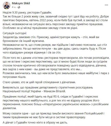 Деталями поділився бізнесмен, фундатор холдингу MS Capital Максим Шкіль. Саме він забронював столик, який згодом зайняв поліцейський.