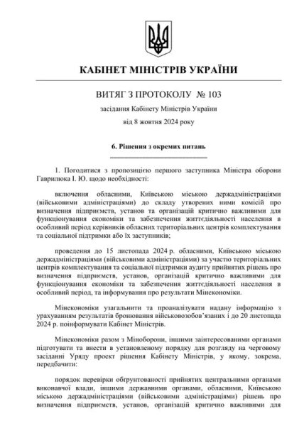 У вівторок, 8 жовтня, Кабінет міністрів України призупинив дію окремих положень щодо визначення критично важливих підприємств до 15 листопада 2024 року. Таке рішення було ухвалено через обурення президента України Володимира Зеленського, спричинене бронюванням 1,5 мільйона осіб.