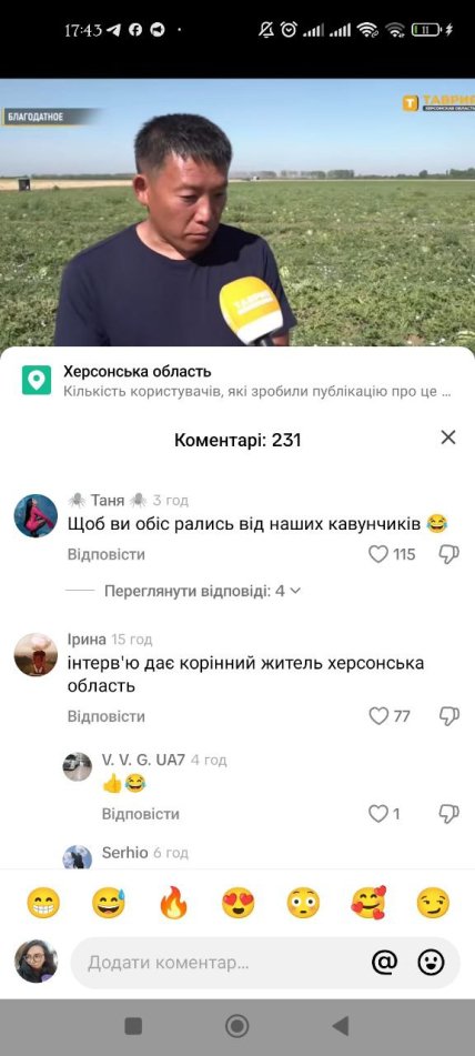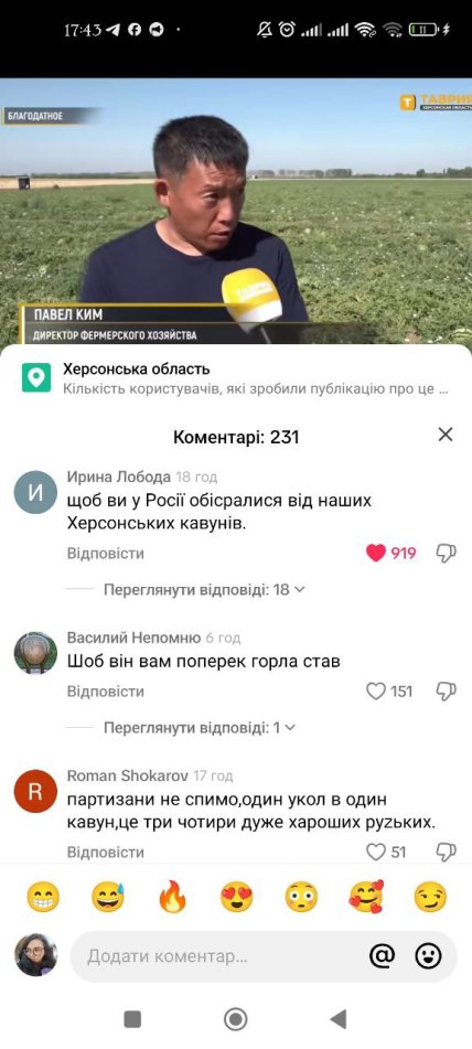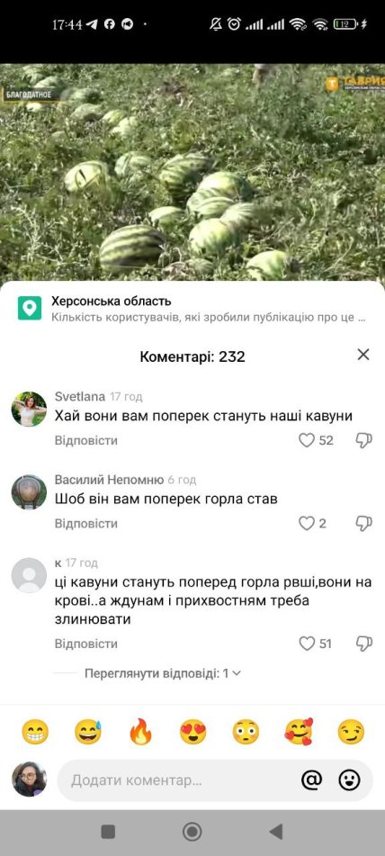 У відео вона також чомусь заявила і те, що “херсонський кавун” є знаковим трендом області, який нібито знають по всій Росії, проте не згадала, що землі на яких вирощують ці ягоди належать Україні.