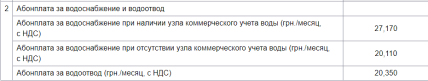 • абонплата за водопостачання за наявності лічильника — 27,17 грн за м³ з ПДВ