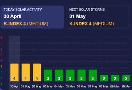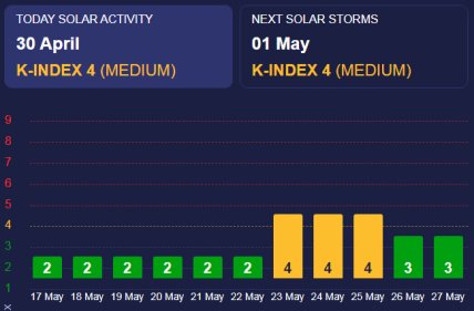 За даними Meteoagent, очікується, що з 1 по 2 травня включно її К-індекс (градація потужності) буде не надто великим і складе 4 бали — середній геомагнітний шторм. Потім її потужність поступово знизиться до 3-2 балів.