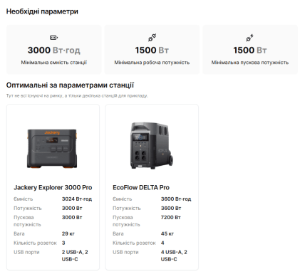 Отже, щоб нагріти бойлер об’ємом 30 літрів, нам потрібна зарядна станція, яка здатна “потягнути” його потужність. 1-1,5 кВт це 1000-1500 Вт. Закладемо для певності 2 години роботи і за допомогою калькулятора розрахунку потужності зарядної станції визначаємо який девайс нам необхідний.