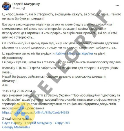 “Ще одна законодавча ініціатива, за яку на мене будуть злитися хабарники і схематозники, які діють проти інтересів громадян і країни, створюючи передумови для отримання “гонорарів” за вирішення проблем, які вони самі штучно і створюють…”, — уточнив Георгій Мазурашу.