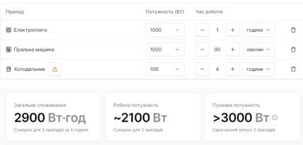 Для цього ми візьмемо: холодильник (чотири години роботи), пральну машину (півтори години роботи), електроплиту (година роботи).