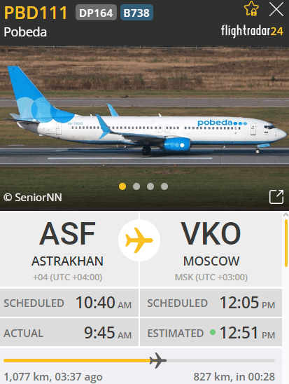 Про це свідчать дані порталу Flightradar24. Близько 10:10 UTC (13:10 за Києвом) над територією України було зафіксовано літак Boeing 737-8MC російської компанії “Побєда”.