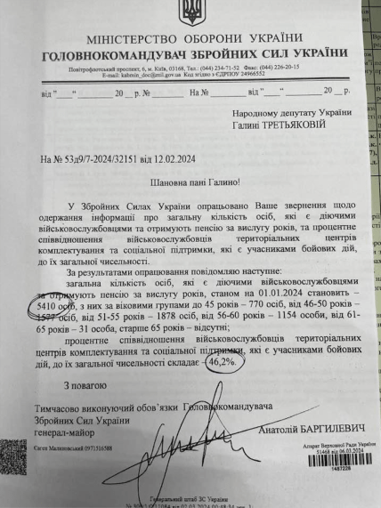 У листі від Міноборони зазначено, що відсоткове співвідношення військовослужбовців територіальних центрів комплектування та соціальної підтримки, які є учасниками бойових дій, до їхньої загальної чисельності складає 46,2%.