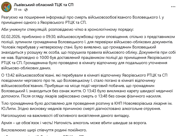 Львівський обласний ТЦК та СП прокоментував звинувачення і стверджує, що причиною смерті діагностовано алкогольне отруєння.