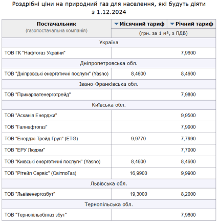 Так, у грудні ціна газу для побутових споживачів, які користуються послугами Нафтогазу, а їх – більшість, залишатиметься на рівні 7,96 грн за кубометр. Ціни на газ у решти постачальників – у межах від 7,7 грн за кубометр до 9,90 грн.