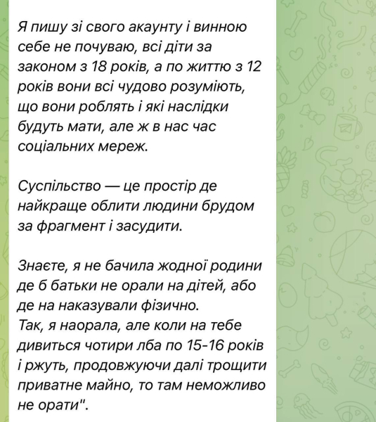 “Винною себе не почуваю, всі діти за законом з 18 років, а по життю з 12 років вони всі чудово розуміють, що вони роблять і які наслідки будуть мати, але ж в нас час соціальних мереж”, — зазначила директорка ліцею.