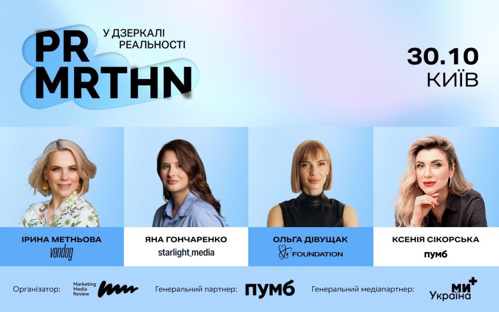 30 жовтня 2025 року понад 300 комунікаційників і маркетологів та 30 спікерів з усієї України візьмуть участь у PR-марафоні «У дзеркалі реальності». У програмі: 4 панельні дискусії, кейси від ПУМБ, «Ковальська», Eva, Bolt, корпорації «Біосфера» та інших топових компаній, церемонія нагородження Конкурсу PR-кейсів.
