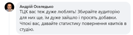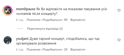 “Дуже гарний концерт, сподобалось, що ТЦК організували розвезення”, — пише один із користувачів. Інший додає: “ТЦК вас теж дуже люблять! Збирайте аудиторію для них ще, їм дуже зайшло і просять добавки.”