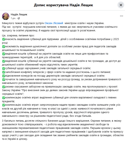 Крім того, омбудсменка розповіла й про інші важливі питання та пропозиції, які турбують освітян. Зокрема, про виділення додаткових коштів (субвенції різного призначення), процедуру обрання директорів шкіл та зменшення навантаження на вчителів. За словами Надії Лещик, щодо деяких питань вдалося знайти порозуміння з міністерством. Утім, міністр освіти Оксен Лісовий поки не прокоментував можливі зміни у школах.