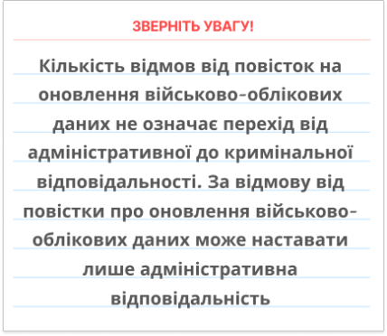 - Відмова від повістки на оновлення військово-облікових даних тягне за собою адміністративну відповідальність у вигляді штрафу. Аналогічна адміністративна відповідальність настає також у випадку отримання та ігнорування такої повістки.
