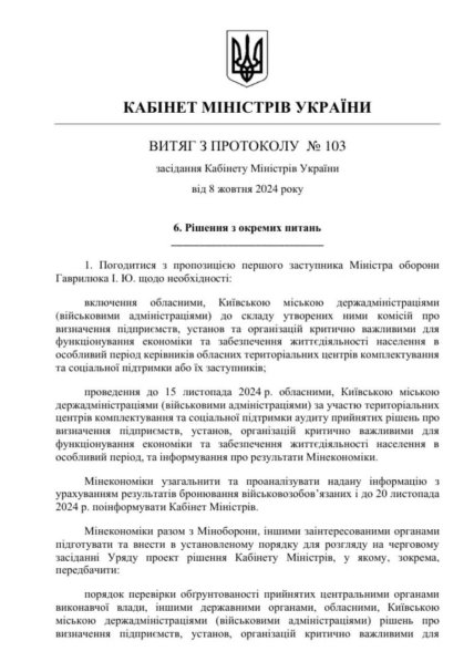 “Почну з того, що Постанову з цього питання Кабмін не приймав. 8 жовтня відбулось засідання, на якому протокольно вирішено, що існує потреба узгодити певні питання бронювання, переглянути раніше прийняті рішення тощо. Це рішення не означає, що вже сьогодні змінюється порядок бронювання чи скасовуються відстрочки“, — пояснила юрист.