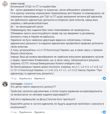 Допис неабияк обурив українську спільноту і, варто зазначити, не безпідставно. Згідно з Конституцією України, кожному громадянину України гарантується право на судовий захист своїх прав і свобод. Водночас, приписами статті 59 Конституції України визначено, що кожен має право на професійну правничу допомогу.
