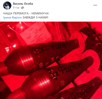 Її чоловік, зять мовознавиці Василь Особа, який, як розповідала сама Фаріон, захищає Україну на фронті, також відреагував на вбивство тещі. Він опублікував фото снарядів, підписаних “За Фаріон”.