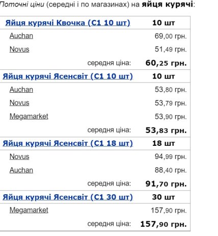 За даними порталу “Мінфін”, яйця “Квочка” 1-ї категорії (10 штук) у супермаркетах “Ашан” коштують 69,00 грн, у супермаркетах Novus — 51,49 грн. Середня ціна — 60,25 грн.