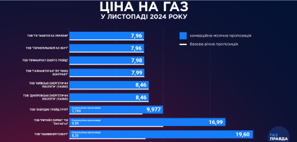 Як і попередні місяці, свої цінники оприлюднили 9 постачальників. Вартість кубометра газу в залежності від газопостачальної компанії коливатиметься від 7,70 до 9,99 гривень за кубометр.