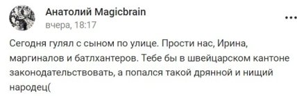 Відповідний коментар Родніної наводить sport24.ru. Ірина вважає, що вулицями РФ блукають лише алкаші, які не мають грошей на кафе.