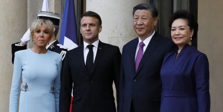 Президента Франції Еммануеля Макрона сфотографували на камеру, де він цілує руку дружині президента Китаю, коли він вітав пару на державному…