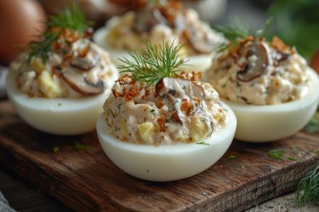 Фаршировані яйця з печерицями! Бюджетний хіт з чотирьох продуктів — справжня знахідка для любителів грибних закусок! Ситна, з пікантною ноткою…
