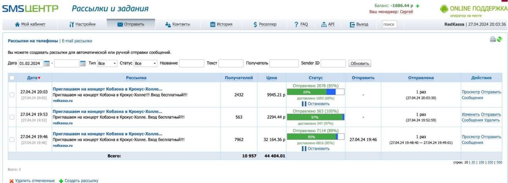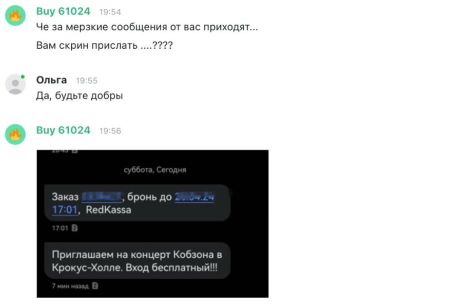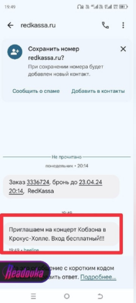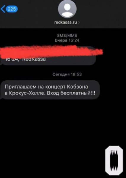 У суботу, 27 квітня, користувачі квиткового сервісу RedKassa почали отримувати на мобільні телефони смс-ки із запрошенням на безкоштовний концерт Кобзона в “Крокус Сіті Холі”. Про це повідомив телеграм-канал “Осторожно, новости”, який прикріпив до свого посту кілька скріншотів із повідомленнями від RedKassa.