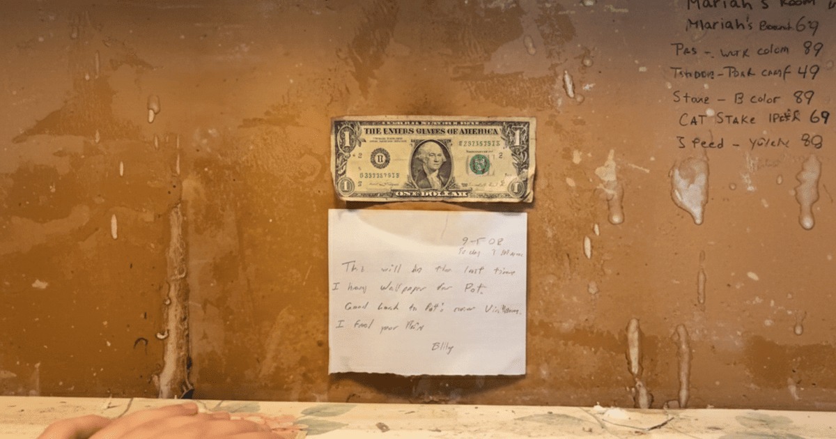 Записка, датована 5 вересня 2008 року, була залишена чоловіком на ім’я Біллі, який жартома назвав це «останнім разом», коли він клеїв шпалери для жінки на ім’я Пет. Автор залишив іронічне побажання «удачі новій жертві Пет», що неабияк розсмішило пару, яка саме знімала старе покриття зі стін.