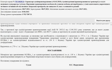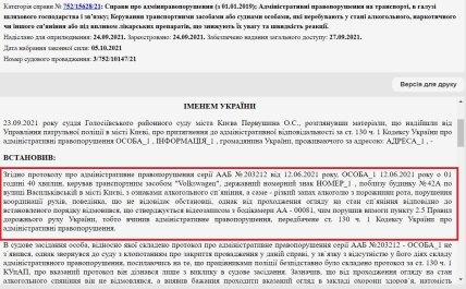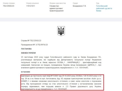Як йдеться у матеріалах справи №752/23543/23, пізно ввечері в Києві на вул. Антоновича він керував транспортним засобом Audi… “з явними ознаками алкогольного сп’яніння, а саме: запах алкоголю з порожнини рота. Від проходження огляду на стан алкогольного сп’яніння у встановленому законом порядку відмовився, чим порушив вимоги п. 2.5 Правил дорожнього руху України, відповідальність за що передбачена ч. 1 ст. 130 КУпАП… В судовому засіданні вину не визнав“.