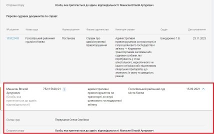 Ще раніше, восени 2021 року, Віталій Манасян фігурував у ще одній адміністративній справі (№752/15628/21) за підозрою у водінні автівки на підпитку. За даними з Єдиного реєстру судових рішень, у Києві на вул. Васильківська його зупинили о першій ночі в автомобілі Volkswagen “з ознаками алкогольного сп’яніння, а саме — різкий запах алкоголю з порожнини рота, порушення координації рухів, поведінка, що не відповідає обстановці, однак від проходження огляду на стан сп`яніння відповідно до встановленого порядку відмовився, що стверджується відеозаписом з бодікамери АА — 00081, чим порушив вимоги пункту 2.5 Правил дорожнього руху України, тобто вчинив адміністративне правопорушення, передбачене ст. 130 ч. 1 Кодексу України про адміністративні правопорушення”.