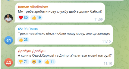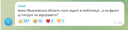 Так, люди під новиною залишили такі коментарі: “Європа. Демократія прогресує.”; “Що там за Конституцією?”; “Івано-Франківська область пасе задніх в мобілізації…а на фронт ці патрулі не відправити?”; “Інших проблем же немає в місті🤡”; “Мм треба зробити нову службу шоб відмити бабки?)”; “Трохи невмінько він,я люблю нашу мову, але це занадто”.
