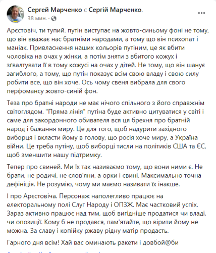 Волонтер Сергій Марченко заочно відповідає Арестовичу, що Путін виступає на жовто-синьому тлі не тому, що вважає нас братніми народами. Цим він демонструє свою владу робити все, що хоче.