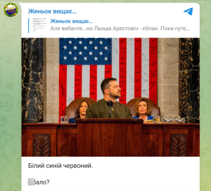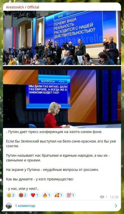 У своєму Telegram-каналі Арестович написав, що “якби Зеленський виступив на біло-синьо-червоному, його вже спалили б”. Екран за спиною Путіна — синій, знизу він підсвічений жовтою смугою, що викликає асоціацію з прапором України.