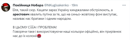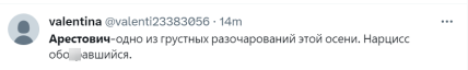 “Арестович — одне з сумних розчарувань цієї осені. Нарцис, що об**явся”, “Б*я, такий сюр. Ка**пи зараз Україну кинджалами обстрілюють, а Арестович хвалить Путіна за те, що на синьо-жовтому фоні виступає, називає нас братами та одним народом. Говорячи таке і використовуючи наші кольори офіційно, він прирівнює нас до їхньої колонії”, “Арестович – це навіть не консерва. Це велика купа смердючого лайна. Мос**лі останнім часом сповнені позитивних очікувань і, схоже, їхній собачка переймає настрій своїх родичів”, — пишуть у мережі.