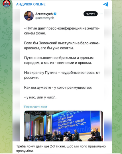 Ця публікація та її тон обурили українців. Хоча дуже мало хто зараз сприймає Арестовича всерйоз, таке відверте підігравання Росії вразило багатьох.