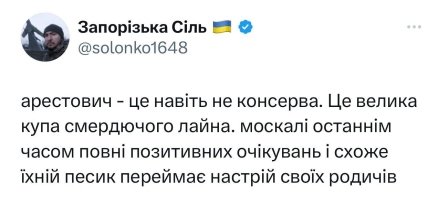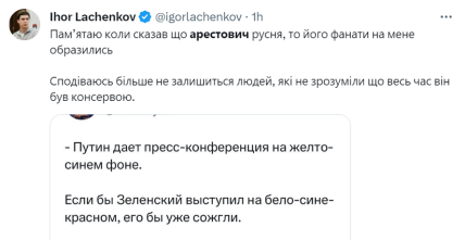 “Пам’ятаю, коли сказав, що Арестович русня, його фанати на мене образилися. Сподіваюся більше не залишиться людей, які не зрозуміли, що весь час він був консервою. Нарешті він уже написав про свого кумира“, — пише блогер Ігор Ланченков.