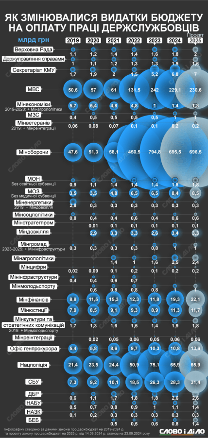 У проєкт бюджету України на 2025 році передбачено збільшення виплат для деяких державних органів. Найбільше отримають службовці Міністерства оборони: у проєкті бюджету-2025 передбачено 696,5 млрд гривень. Разом з тим, зарплати держслужбовців до повномасштабної війни так само не були низькими.