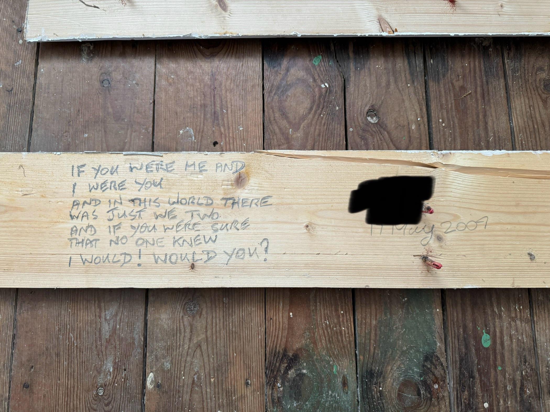Записка, зроблена від руки, звучала майже як загадка: «Якби ти був мною, а я тобою, і в цьому світі були лише ми двоє — і якщо б ти був упевнений, що ніхто не дізнається, — я б зробив це! А ти?». Датована травнем 2007 року, ця фраза понад 18 років пролежала за плінтусом, доки новий власник не натрапив на неї під час ремонту.