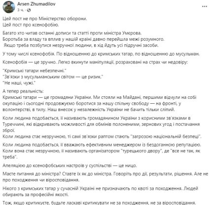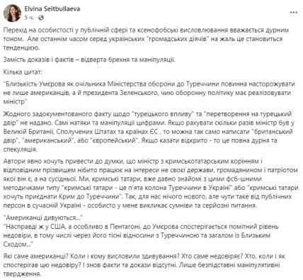 Представники кримських татар, серед яких голова підконтрольного Міноборони “Державного оператора тилу” Арсен Жумаділов та журналістка Ельвіна Сеітбуллаєва, вважають такі слова ксенофобією.