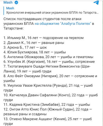 Один із російських Telegram-каналів публікує список постраждалих студентів. За його даними, серед них є неповнолітні, вік постраждалих – нібито від 16 до 25 років.