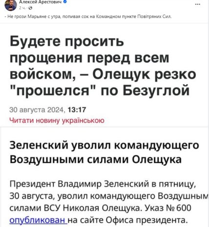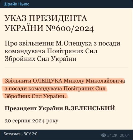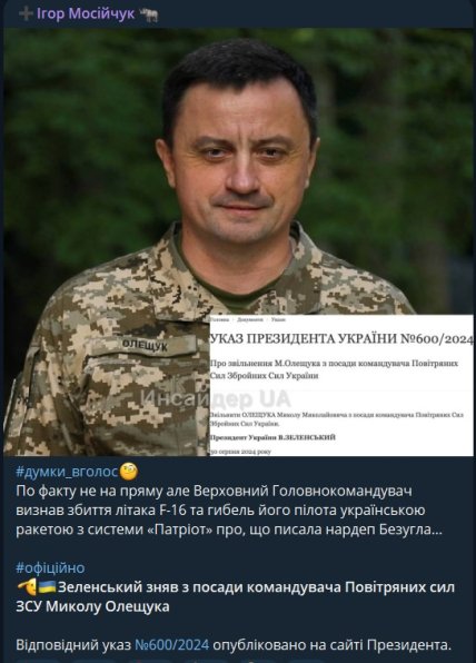 “По факту не на пряму, але Верховний Головнокомандувач визнав збиття літака F-16 і загибель його пілота українською ракетою з системи “Патріот”, про що писала нардеп Безугла Офіційно, Зеленський зняв з посади командувача Повітряних сил ЗСУ Миколу Олещука”, — написав він.
