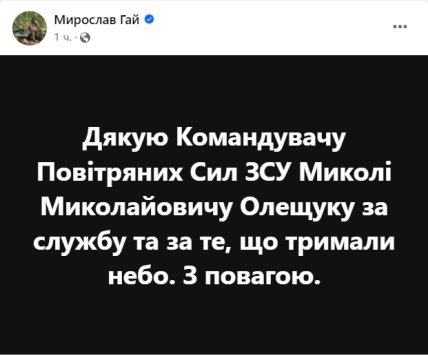 “Дякую за службу і за те, що тримали небо. З повагою”, — написав Мирослав Гай.