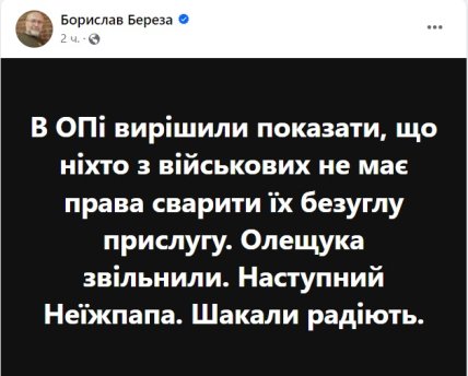 “В ОП вирішили показати, що ніхто з військових не має права лаяти їхню безуглу прислугу. Олещука звільнили. Наступний Неїжпапа. Шакали радіють”, — написав політик.