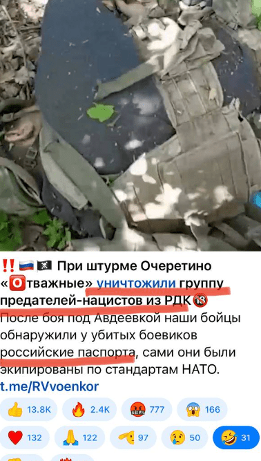 “21 квітня Z-канали радісно опублікували відео російських військових з-під Очеретино, які стверджували, що знищили “зрадників з РДК” і показували цілу групу 200-х. Убиті були в натовській формі, у них були російські паспорти”, — йдеться у повідомленні. .