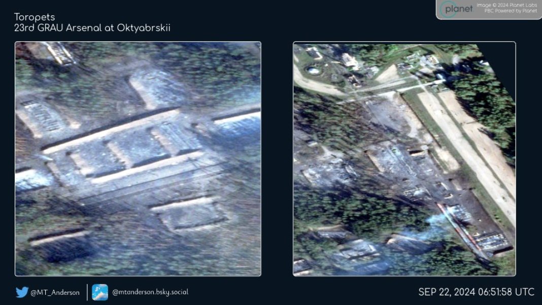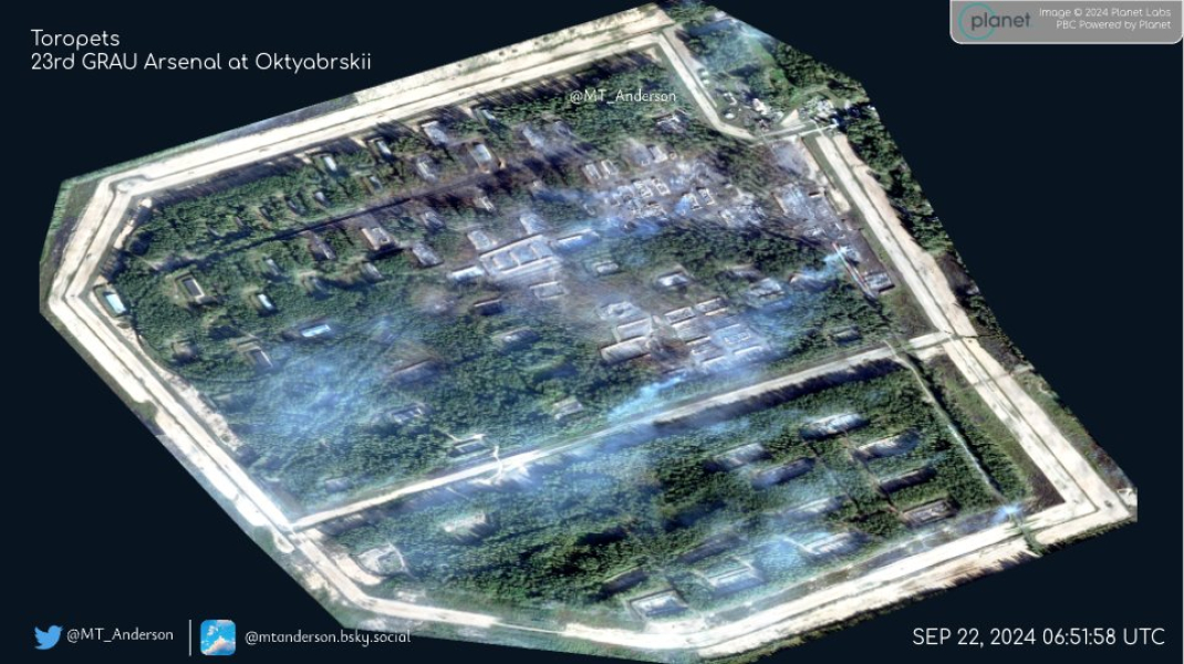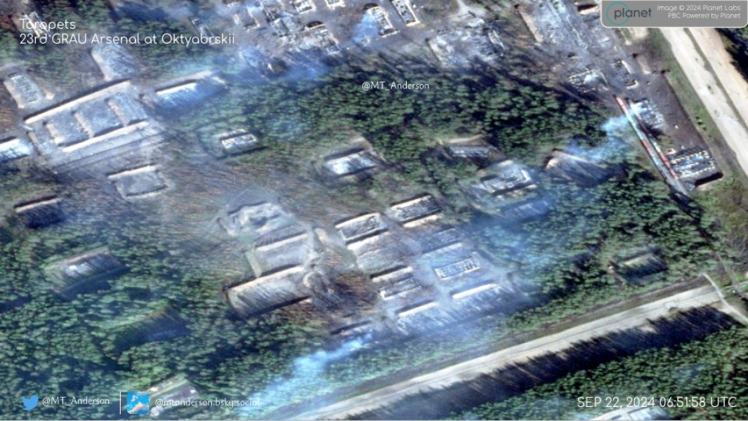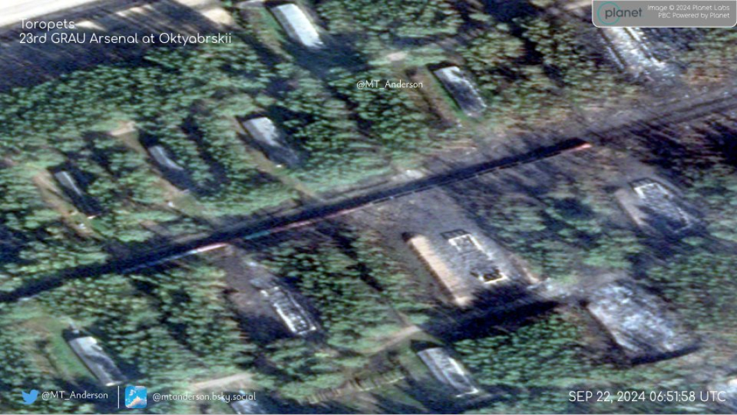 З’явились нові супутникові фото 23-го арсеналу Головного ракетно-артилерійського управління (ГРАУ) Міноборони РФ, що розташований в районі селища Октябрський у Тверській області. Їх опублікував у соцмережі X (раніше — Twitter) американський OSINT-дослідник MT_Anderson 22 вересня.
