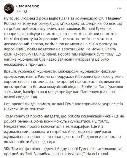 Козлюк нагадав, що за два роки роботи Гуменюк забороняла репортерам відвідувати будь-які місця у зоні відповідальності ОК “Південь”, включаючи деокуповану частину Херсонської області, лінію фронту та навіть місце лиха після руйнування Каховської ГЕС.