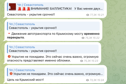Окрім цього, станом на 15:48 у російських пропагандистських каналах пишуть, що наразі є небезпека для Кримського мосту, який раніше був атакований Збройними силами України.