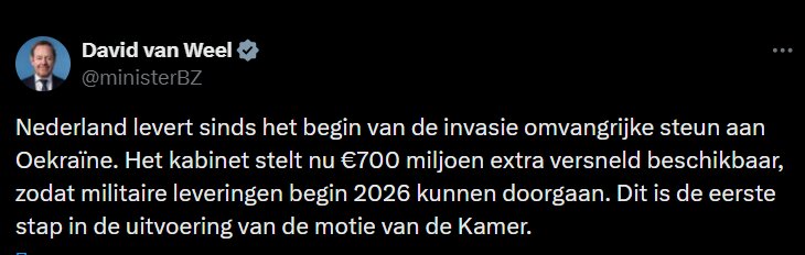 Міністр закордонних справ Нідерландів Девід ван Веель підтвердив виділення нового траншу та наголосив, що прискорене фінансування має забезпечити безперервність військової підтримки на початку 2026 року.